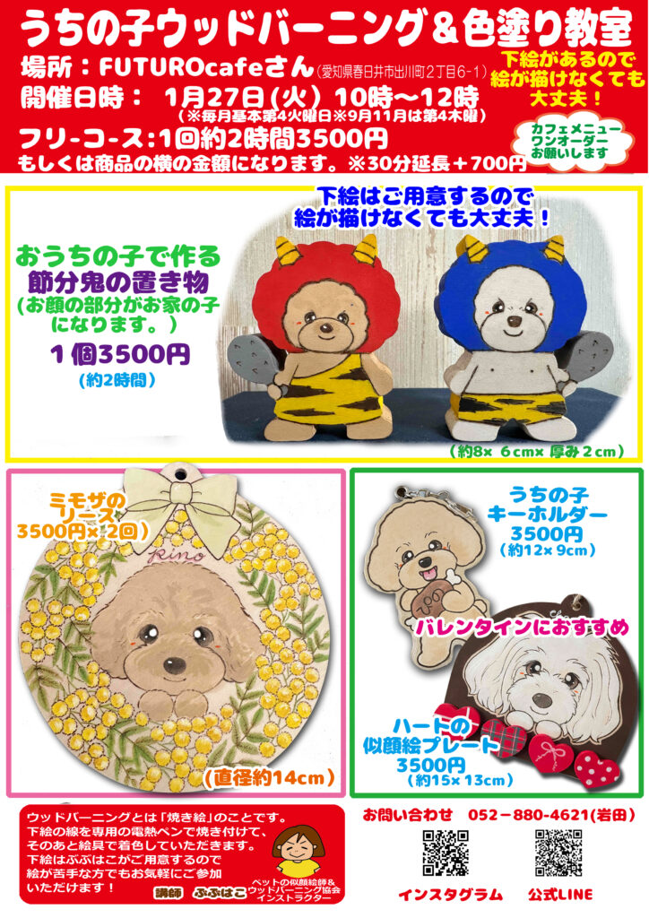 ●お持ち込み素材にわんちゃんの下絵をお描きしたり、焼いたりも可能です。(下絵はぶぶはこで、その後ご自身で焼く場合は1000円~ ぶぶはこが焼く場合は1500円~ 大きさや頭数、背景の小物などで+料金発生します)